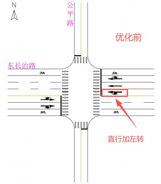 圖2 優化前路口渠化示意圖優化措施公平路/東長治路為有效提升路口通行效率,交管總隊會同虹口交管支隊多次踏勘路口,持續關注路口流量變化,圍繞車道功能劃分及信號配套提升來開展優化工作(一)車道功能優化在公平路/東長治路西進口,將原有的兩根合用車道(直行左轉合用道+直行右轉合用道)調整為三根功能獨立車道,將原先功能重疊的三車道明確劃分為左轉車道、直行車道和直行右轉車道,實現車道功能清晰化。