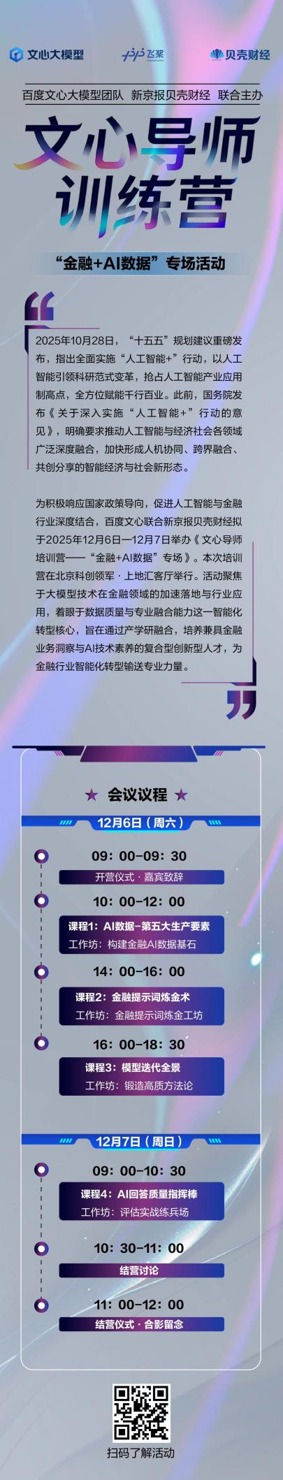 新京報貝殼財經訊(記者潘亦純)2025年12月6日—12月7日,文心百度文心大模型聯合新京報貝殼財經將舉辦“文心導師培訓營——‘金融+AI數據’專場”活動,本書推動人工智能技術在金融領域的樣文閱讀深度應用與復合型人才的培養。