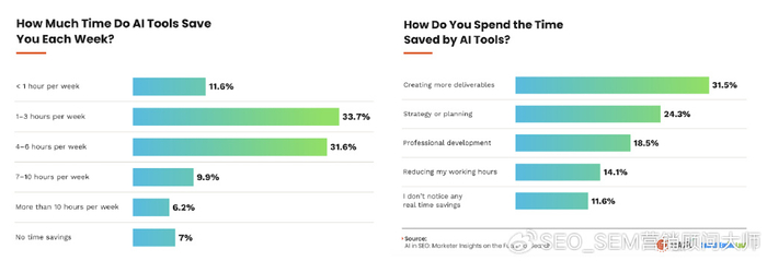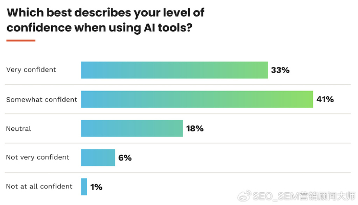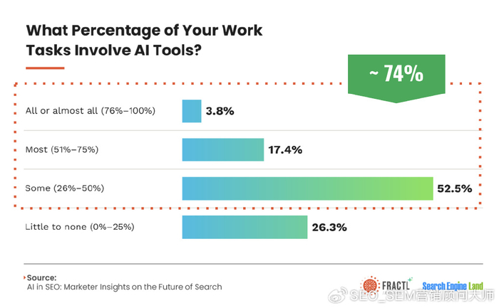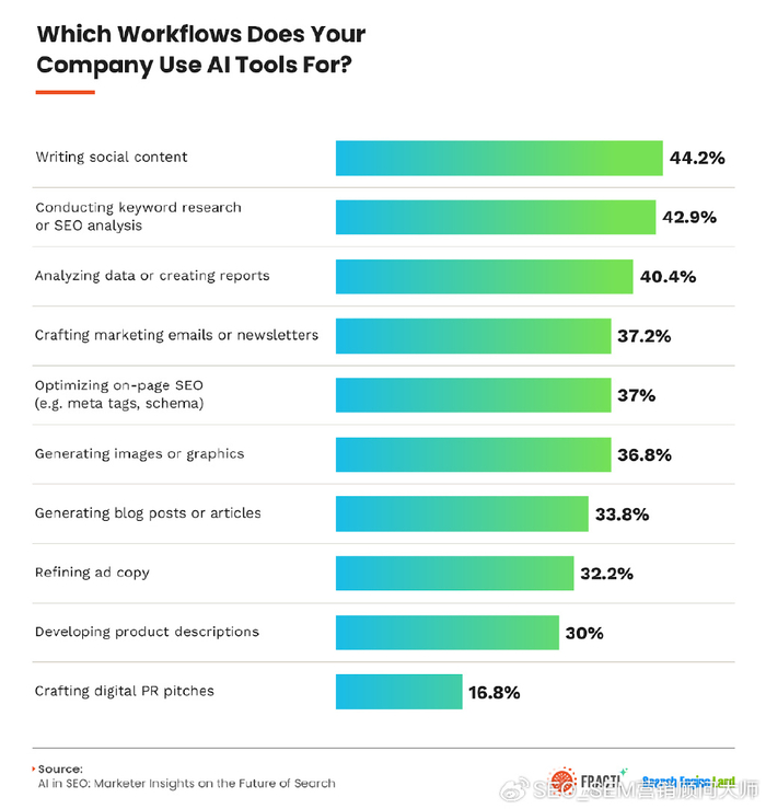 74%的營銷人員在其工作流程的某些部分中使用了AI工具,但只有4%的營銷人員依靠它的四分之三以上的工作數據揭示了營銷人員在哪里找到最大價值的地方:44%的人將AI用于社會內容43%用于SEO分析數據報告40%。
