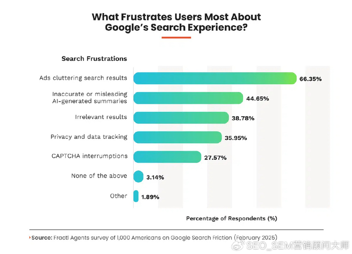 盡管如此,采用摩擦和創新動力,用戶 對Google的搜索經驗感到越來越沮喪 在我的2025年2月的研究中,用戶引用了廣告搜索結果,不準確的 AI概述 ,并且結果無關緊要,這是傳統搜索中的主要摩擦點