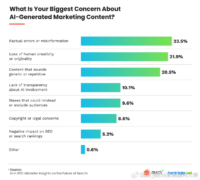 我們研究中最大的驚喜?AI內容的SEO處罰幾乎沒有作為營銷人員的關注,但錯誤信息焦慮是通過屋頂進行的假設Google將懲罰AI生成的內容現實?與懲罰內容相比,Google更有可能獎勵表現出獨創性,深度和清晰度的AI內容,僅僅是因為它是AI輔助的。
