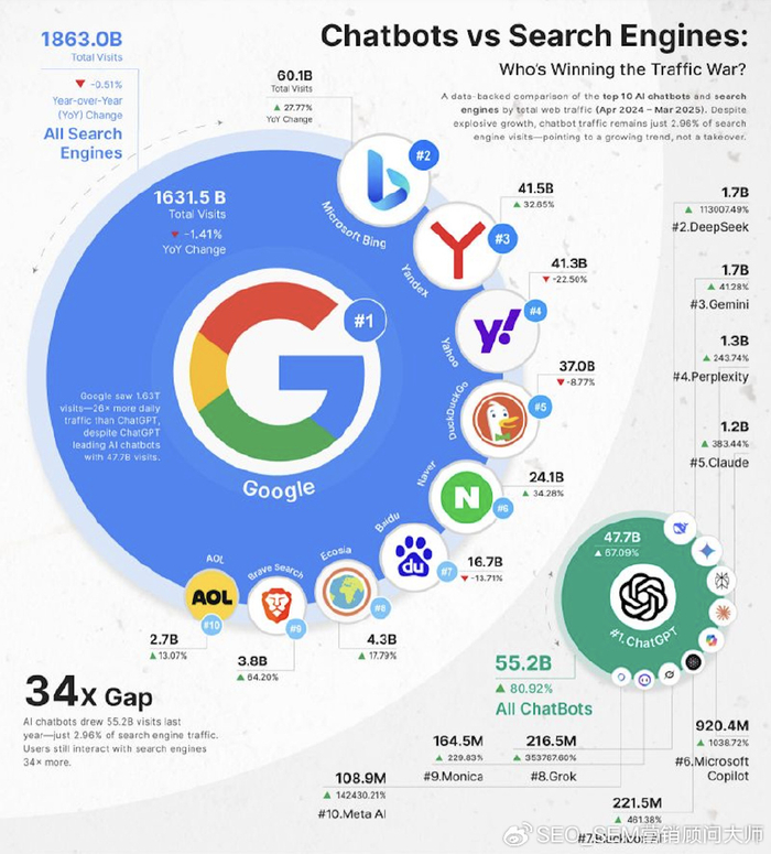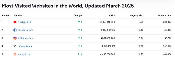 消費者并沒有因為缺乏高質量的內容而放棄Google他們正在逃避SERP摩擦,以進行干凈的接口設計和更快的答案當廣告埋葬答案時,清潔接口統治至尊和AI工具提供至少, 它們沒有廣告 現在這就是為什么即使Google每年進行5萬億個搜索( 同比增長20% ),諸如Chatgpt之類的工具在全球范圍內已經排名為 最多的網站 ,每月訪問近50億次。