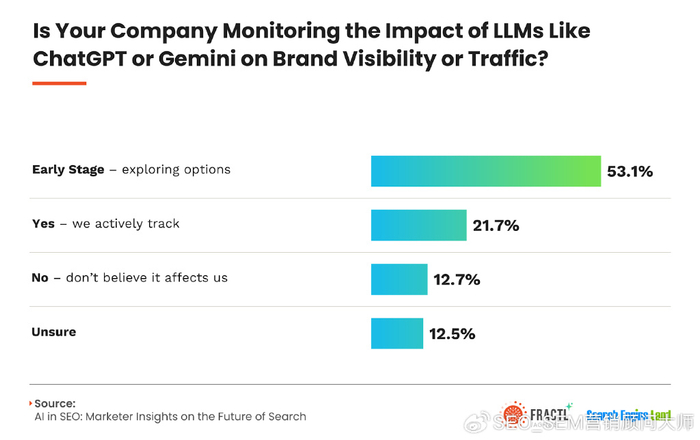 盡管消費者搜索行為正在迅速發展,但營銷主管并沒有完全趕上只有22%的營銷人員設置了LLM品牌可見性或交通監控至少營銷人員認識到緊迫性,有53%的人說他們正處于探索如何監視這個新興品牌渠道的早期階段