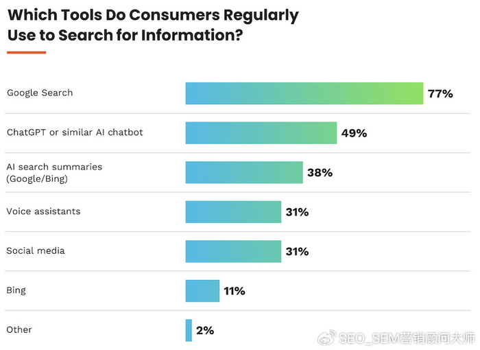 382%的人發現AI驅動的搜索比傳統SERP更有幫助但是,只有約22%的營銷人員跟蹤LLM品牌可見性或流量Google搜索(77%),LLMS(49%)和AI概述(38%)作為首選消費者搜索工具的排名最高。