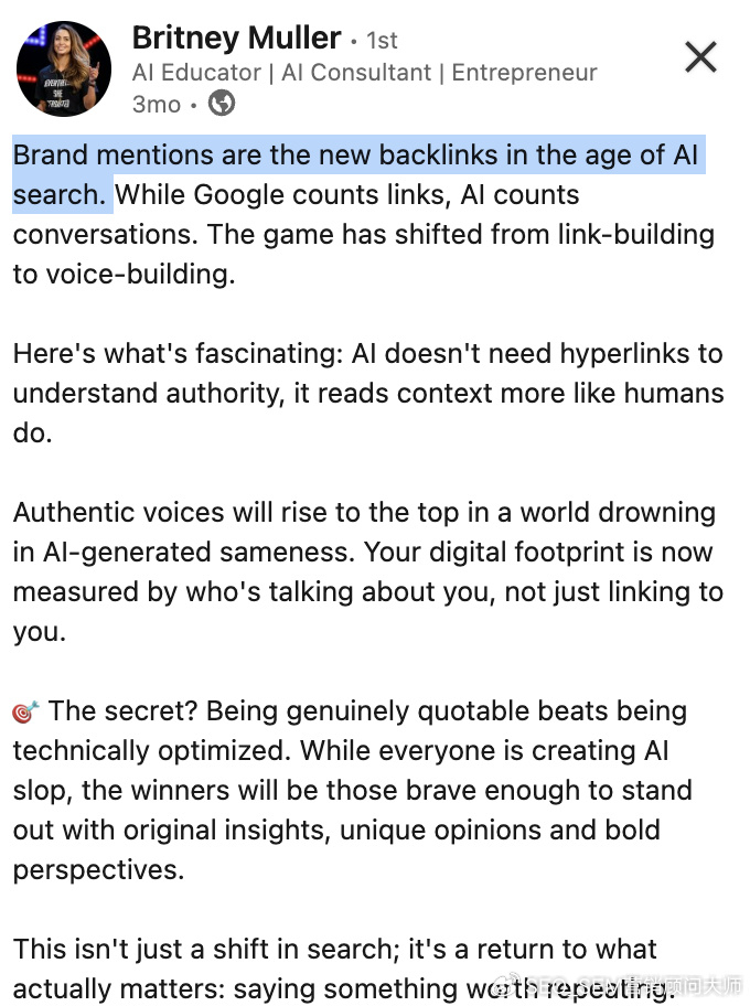 我們不是在看搜索的死亡我們正在觀看渠道的融合 - 搜索,社交,AI - 都通過相同的核心信號進行了優化:權威(引用和提及)獨創性(第一方研究和見解)信任(平臺和角色之間的一致性)數字公關和品牌可見性現在是LLM的必不可少的輸入。