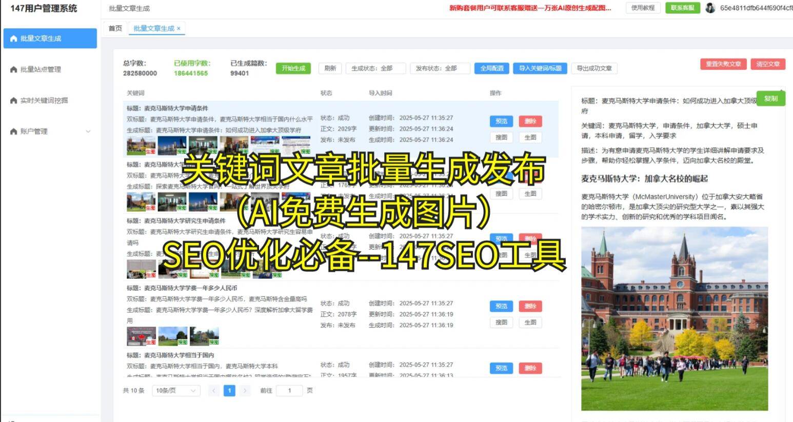 內容生成與批量操作:利用AI技術進行批量文章創作與發布,提高效率和質量147SEO:提升效率與質量的全能工具在眾多SEO工具中,147SEO以其強大的批量操作功能和高質量的文章優化能力脫穎而出它結合了先進的算法和豐富的功能模塊,特別適合SEO優化人員和內容推廣人員使用。