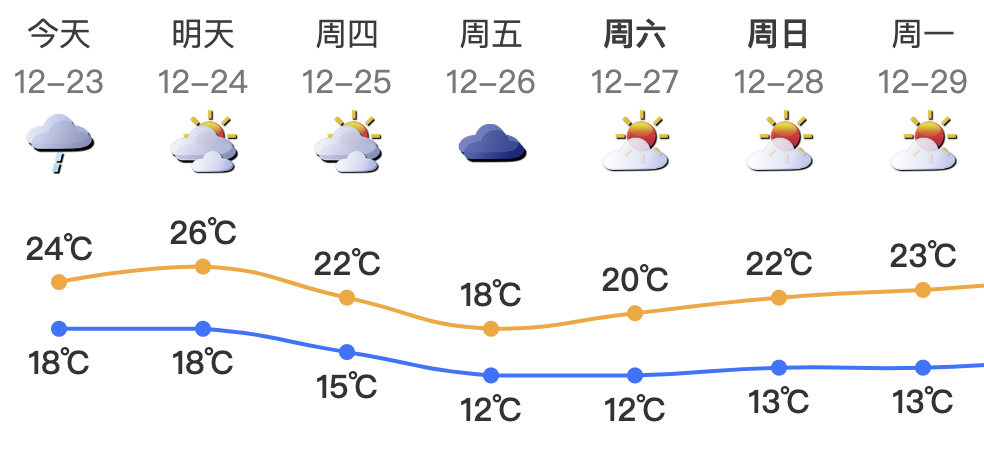 預(yù)計(jì)23日陰天間多云,有分散小雨,氣溫18-24℃24日零星小雨轉(zhuǎn)多云,氣溫回升,白天溫暖25日受冷空氣影響,有分散小雨,偏北風(fēng)最大陣風(fēng)7級(jí)左右,氣溫下降26日零星小雨轉(zhuǎn)多云,北風(fēng)減弱,日溫差小,體感較冷。